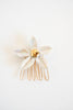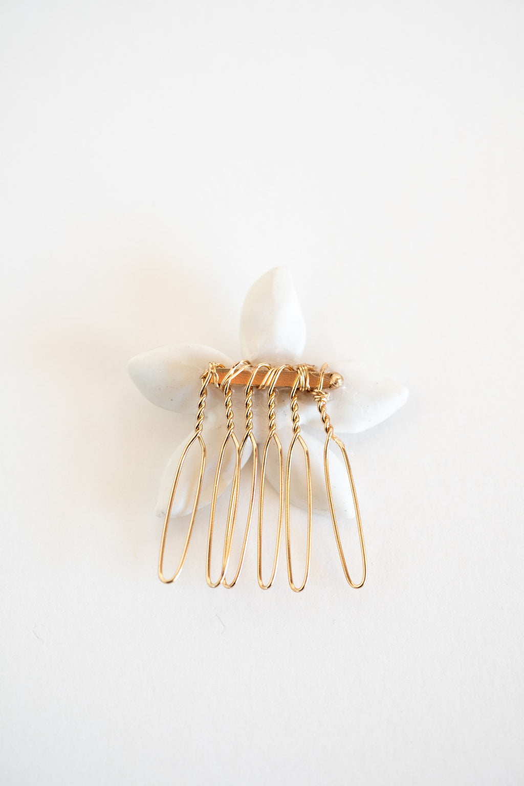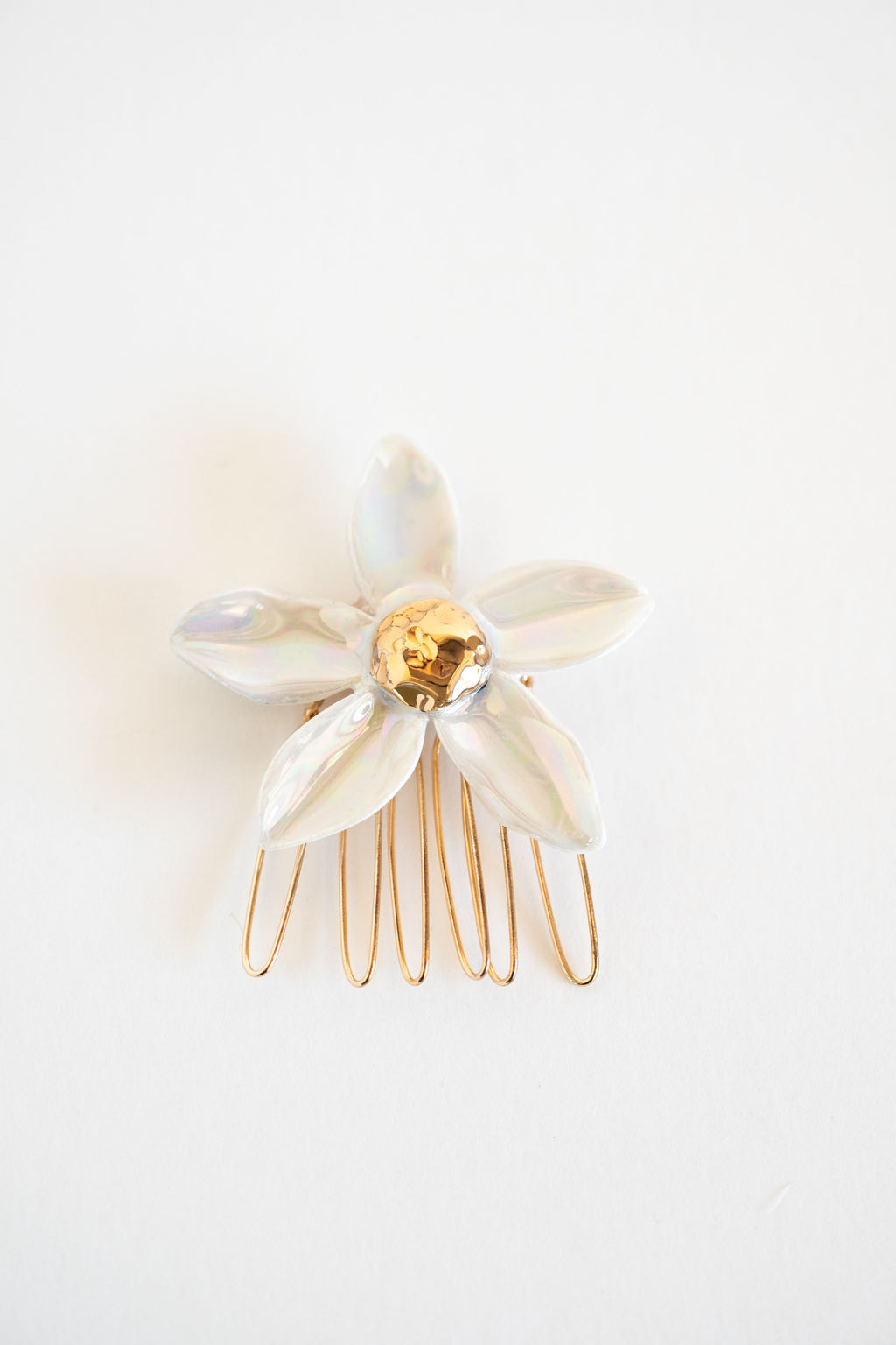 Hand-built in porcelain, the Daisy Hair clip features delicate petal forms edged in radiant 18k gold lustre. Designed to echo the charm of the classic bloom, it is mounted on a fine gold-toned comb for effortless styling. A luminous accessory from Bloom – The Bridal Collection, this piece is perfect for brides seeking a romantic floral accent to complete their look.