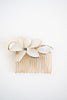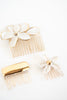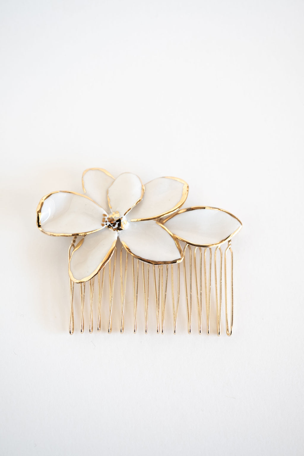 Delicately hand-built in porcelain, the Bloom Hairclip features sculpted petals edged with radiant 18k gold lustre. Mounted on a fine gold-toned comb, it’s designed to sit effortlessly in the hair, adding a touch of luminous elegance. A statement accessory from Bloom – The Bridal Collection, this piece is perfect for brides seeking a timeless floral accent to complete their look.