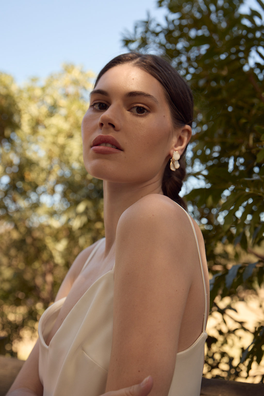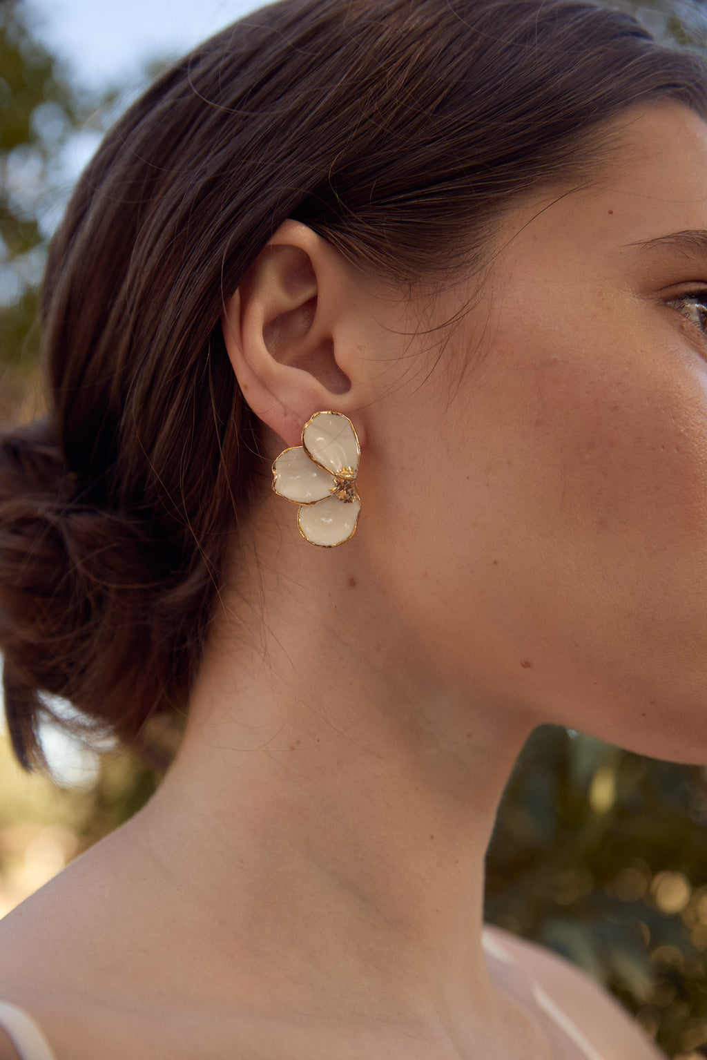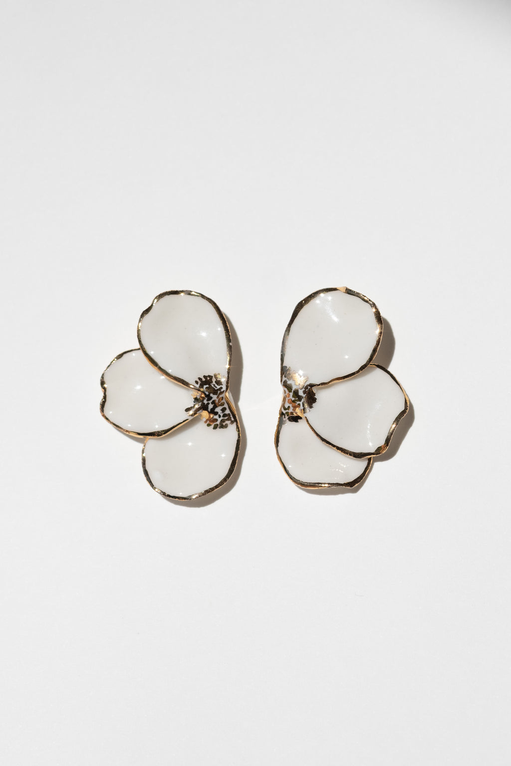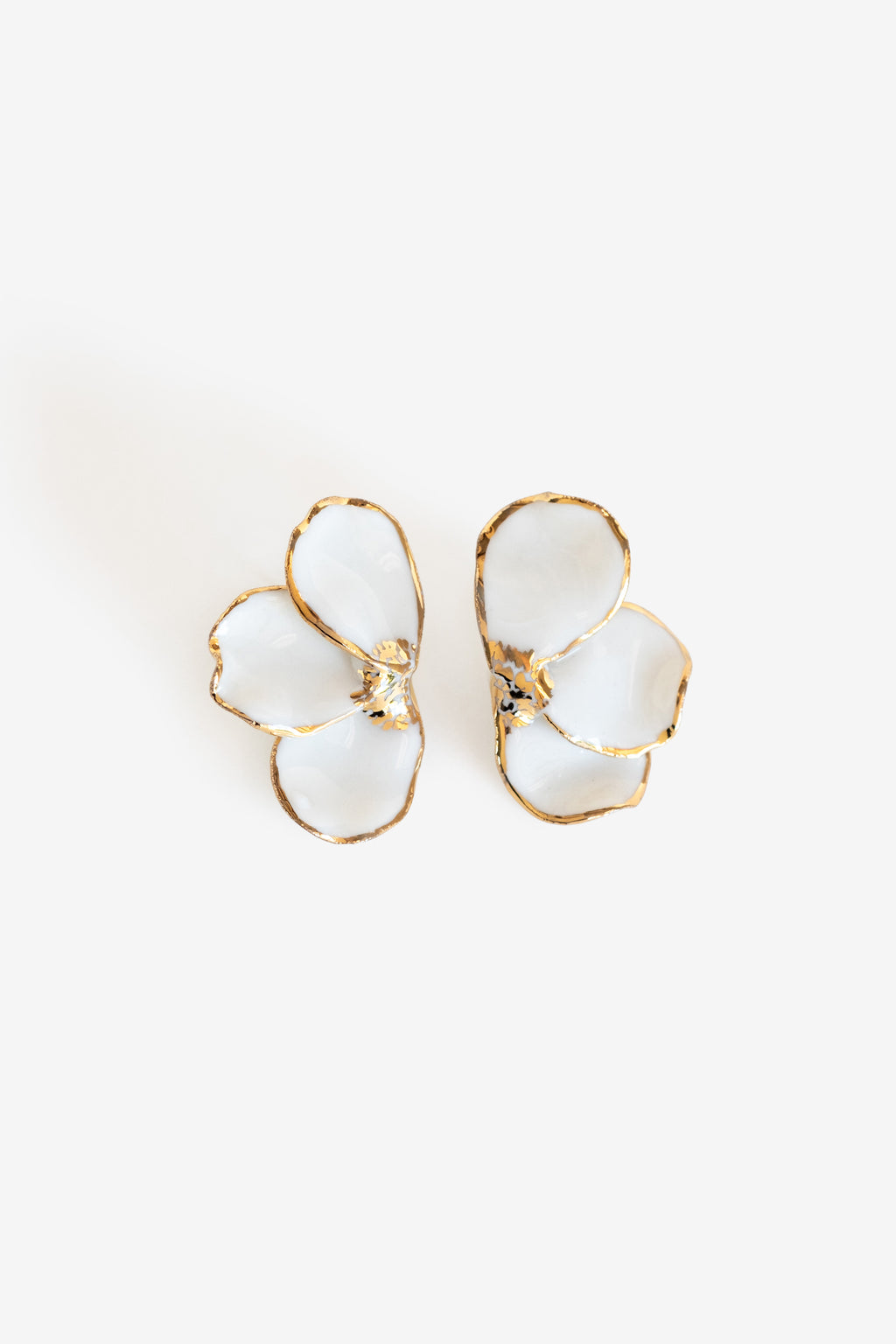 The Primrose Earrings are delicately hand-built in porcelain, their soft, overlapping petals inspired by the gentle charm of the primrose flower. Each piece is painted and finished with 18k gold lustre along the edges, adding a radiant frame to the pure white porcelain. A luminous statement from Bloom – The Bridal Collection, these earrings are perfect for brides seeking refined elegance and timeless floral beauty on their wedding day.
