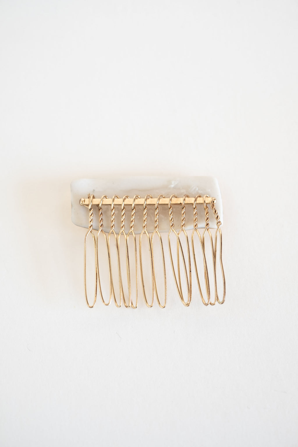 Minimal yet striking, the Sage Hairclip is hand-built in porcelain and finished in a bold layer of 18k gold lustre. Its smooth rectangular form echoes the modern silhouette of the Sage Earrings, offering a sculptural accent for bridal or special occasion hairstyles. A refined piece from Bloom – The Bridal Collection, it brings contemporary elegance to timeless floral-inspired adornment.